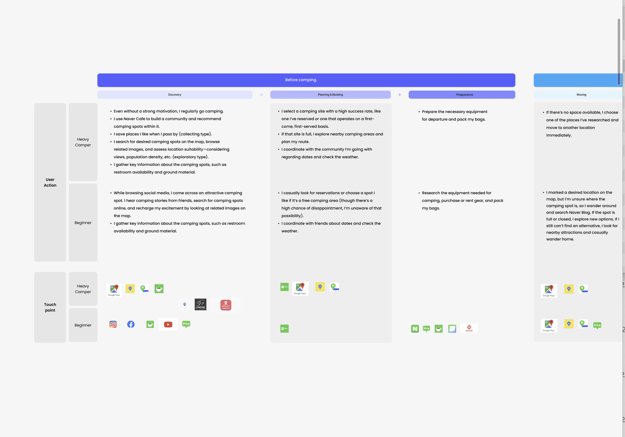Based on research findings, we defined personas and mapped the overall camping experience blueprint. Using this foundation, each team member prepared hypotheses for a collaborative workshop.